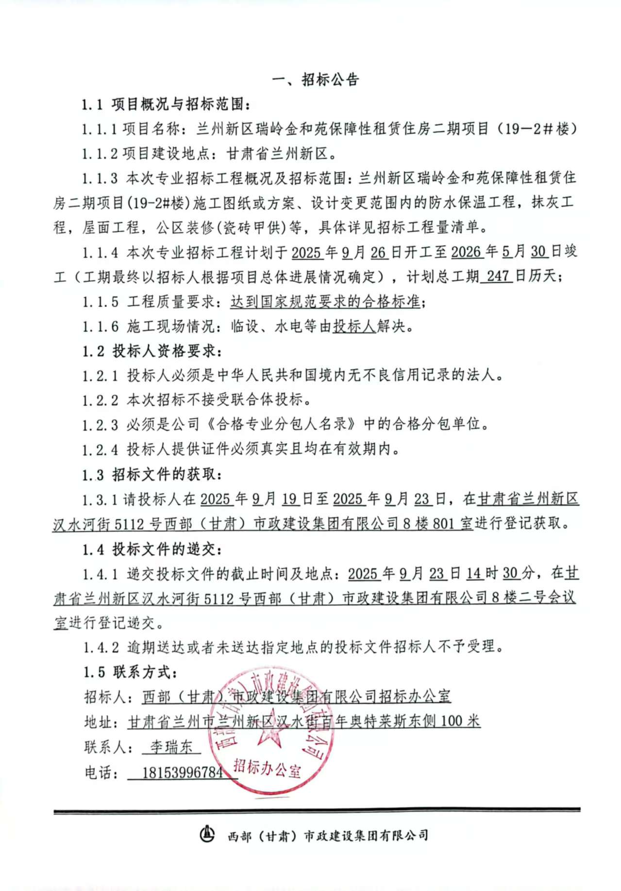 蘭州新區(qū)瑞嶺金和苑保障性租賃住房二期項(xiàng)目(19-2#樓)防水保溫工程、抹灰工程、屋面工程、公區(qū)裝修(瓷磚甲供)等專業(yè)分包-招標(biāo)公告